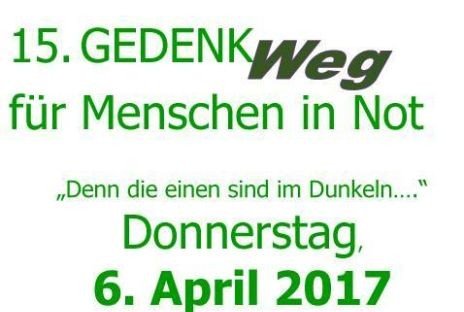 Am 6. 4. 2017 beging eine interreligiöse Initiative schon zum 15. mal den Gedenkweg für Menschen in Not im 9. Wiener Gemeindebezirk. Er stand diesmal unter dem Motto "Denn die einen sind im Dunkeln".