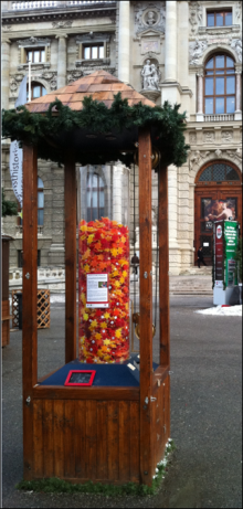 Insgesamt schwebten 4.200 Wachssterne in die große Glasröhre im Pavillon am Weihnachtsdorf Maria Theresienplatz. Der gespendete Gesamtbetrag von 2.100 Euro ermöglicht die Anschaffung eines Spezialbettes für David, damit der Start in die neue Wohnung barrierefreier wird.