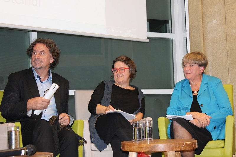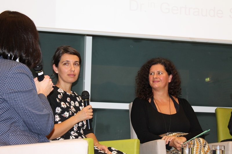 Dr.in Maria Katharina Moser, Theologin und Ethikerin, modierte die Podiumsdiskussion, an der sich Min.Rat Dr. Ewald Filler, Leiter der Abteilung Familienrechtspolitik & Kinderrechte des Bundesministeriums für Familie und Jugend, Desislava Dudjunova, ehemalige Bewohnerin und Kindergruppenbegleiterin, Astrid Juraske, stellv. Leiterin CS Haus für Mutter und Kind, FH-Prof.in Dr.in Michaela Moser Sozialexpertin der Armutskonferenz und Dr.in Getraude Steindl von der Aktion Leben beteiligten.