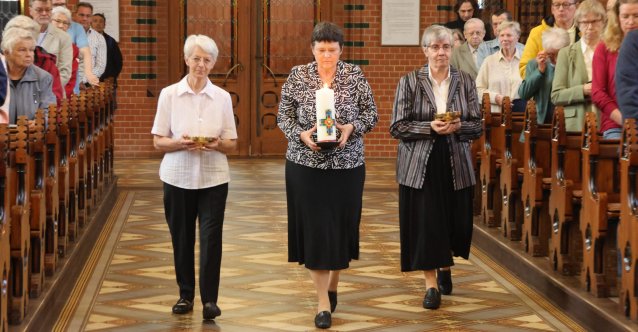 Im Rahmen eines Gottesdienstes mit Bischof Wolfgang Ipolt in der Kathedrale St. Jakobus wurden Sr. Martina Theiner und Sr. Maria Zemmer am Samstag, 13. 9. 2025 verabschiedet. Nach 26 Jahren schließt die Schwesterngemeinschaft Caritas Socialis ihre Niederlassung in Görlitz. Die Schwestern wohnten seit 1999 in der Wohnung in der Elisabethstraße, in der Hildegard Burjan geboren wurde. Sie wirkten in der Klinikseelsorge, im Hildegard Burjan Heim und in der Pfarre. Bischof Wolfgang Ipolt dankte für den Einsatz der Schwestern der Caritas Socialis. Görlitz verliere zwei Zeuginnen der Liebe Gottes und zwei Beterinnen. Sr. Susanne Krendelsberger erinnerte an die Schwestern, die in Görlitz gelebt haben, sie dankte Prälat Peter C. Birkner, der den Kontakt nach Wien hergestellt hatte und die Geschichte Hildegard Burjans in Görlitz erforscht hat. Sie dankte Bischof Ipolt und den Gläubigen der Diözese, die den Schwestern stets mit Wohlwollen begegnet sind und ihnen Heimat in Görlitz erleben ließen. Im Anschluss gab es bei einem Empfang viele Hände zu schütteln. Bei der Gabenbereitung trugen Sr. Martina Theiner und Sr. Maria Zemmer die eucharistischen Gaben zum Altar. Sr. Susanne Krendelsberger trug eine Kerze zum Altar, die Sr. Olga Šćurk gestaltet hatte.