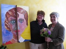 Die Künstlerin Charlotte Heinich überreicht ein Bildnis Hildegard Burjans