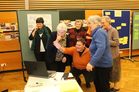 In einer Abendeinheit nahmen die Schwestern die Veränderungen im Amtsverständnis, den Aufgaben und Herausforderungen der Generalleitungen seit der Gründung der CS in den Blick. Dabei gab es auch humorvolle Begebenheiten mit den Generalleiterinnen zu berichten. Sr. Clotilde R. Bonfim war per Skype zugeschaltet. Sie berichtete über die Veränderungen im Kontakt zwischen Brasilien und der Generalleitung. War in den ersten Jahren der Kontakt nur per Post möglich, einmal im Jahr leistete man sich einen Telefonanruf, so kann man nun per Whatsapp, Skype, E- Mail in Sekundenschnelle kommunizieren und die Sprachkenntnisse beider Seiten haben sich verbessert.
