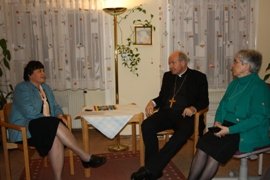 Abschließend kam es zu einem Gespräch mit MitarbeiterInnen der CS Beratungsdienste. Sie gaben Einblick über die Armut der Menschen, die sich an diese Beratungstelle wenden. Sr. Susanne Krendelsberger CS, die sich in der Initiative von sechs Ordensgemeinschaften, Solwodi Österreich, gegen Menschenhandel engagiert, berichtete von dem Projekt, in dem seit Oktober eine Schutzwohnung für betroffene Frauen betrieben wird. Kardinal Schönborn zeigte sich sehr interessiert an den vielfältigen sozialen Aktivitäten.