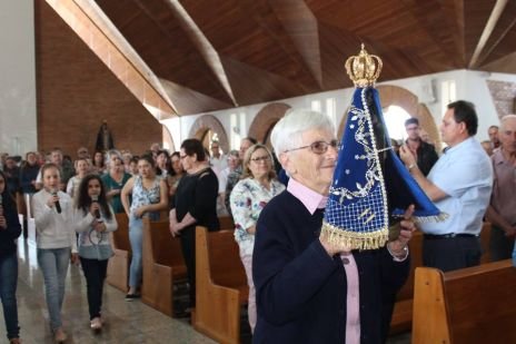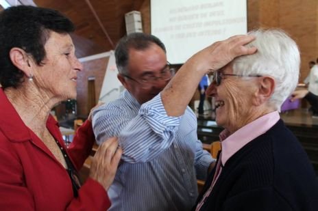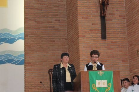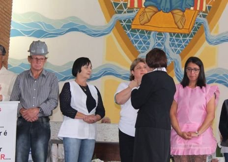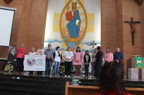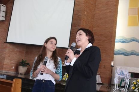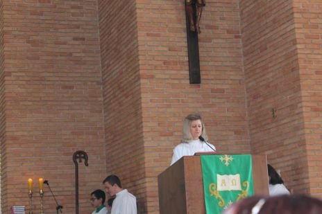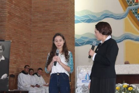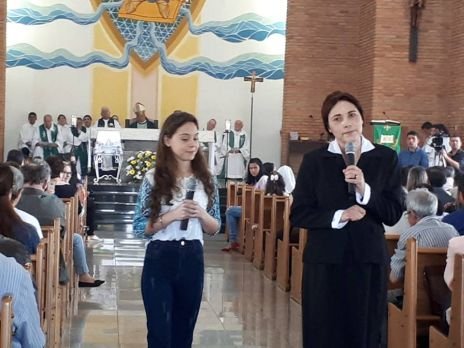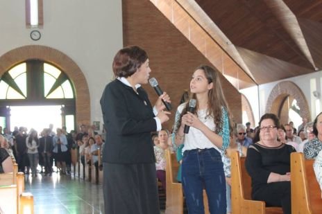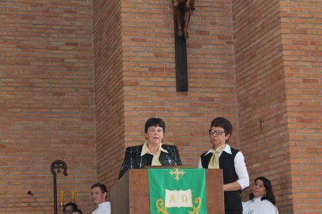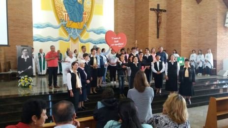 Der Chor, in dem auch Sr. Clotilde R. Bonfim, Sr. Laura Marcelino und Sr. Karen D. Klaczek mitsingen, sang viele eigens für das Fest einstudierte Lieder, die sehr berührend waren und das Charisma der CS wiedergaben. Auch Hildegard Burjan war beim Fest präsent. Nach der Kommunion traten zwei Personen auf: Joceli Ramos stellte sehr eindrucksvoll Hildegard Burjan dar, die mit einer jungen Frau über die Geschichte der CS und über die Geschichte Hildegard Burjans sprach. Hildegard Burjan bedankte sich im Anschluss bei einigen Menschen, die in den Altarraum gekommen waren, dass sie ihre Idee weiter führen. Auch dieser Moment war sehr berührend. Hildegard Burjan küsste die Hände der MitarbeiterInnen und WegbegleiterInnen, die stellvertretend für viele nach vorne gekommen waren. Unter ihnen war auch eine Gruppe aus Curitiba, wo die Schwestern ein Projekt mit Müllsammlern begleitet hatten.
