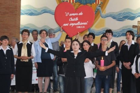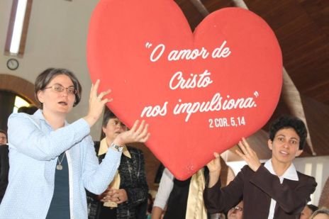 Zum Lied „Tudo por causa de um grande amor" („Alles um einer großen Liebe willen") zogen alle CS Schwestern mit einem großen Herz, auf dem „Die Liebe Christi drängt uns" stand nach vorne und wurden von Hildegard Burjan begrüßt. Sr. Susanne ging anschließend in ihrer Rede – in portugiesischer Sprache – auf die Geschichte der CS in Brasilien ein und dankte den Schwestern, den Externen Mitgliedern und den MitarbeiterInnen, die eine große Familie der CS in Brasilien bilden.