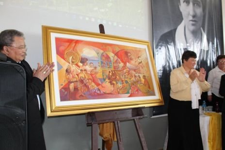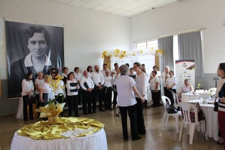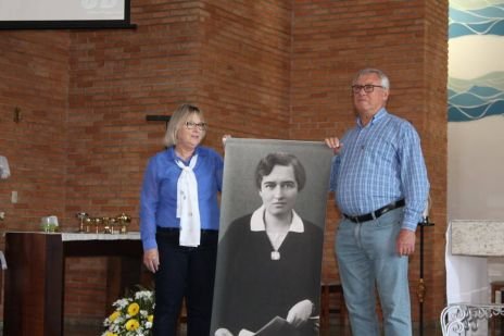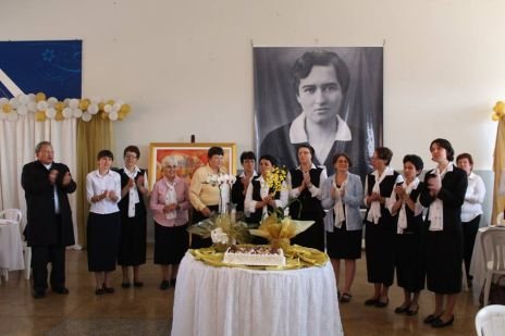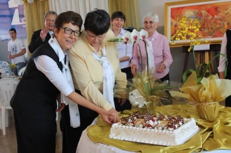 Im Festsaal ging das Fest weiter: dort präsentierte Sr. Clotilde R. Bonfim die neu aufgelegte Hildegard Burjan Biografie. Bischof Wagner da Silva und Sr. Susanne Krendelsberger enthüllten das Bild, das zum Jubiläum gemalt wurde. Der Chor von Entre Rios (Donauschwaben) sang einige Lieder mit deutschem und mit portugiesischem Text. Nach dem köstlichen Essen gab es noch ein Geburtstagsständchen für die CS Schwestern zum 50er und eine Geburtstagstorte, die von Sr. Susanne Krendelsberger und Sr. Laura Marcelino, der Gesamtverantwortlichen für Brasilien gemeinsam angeschnitten wurde.