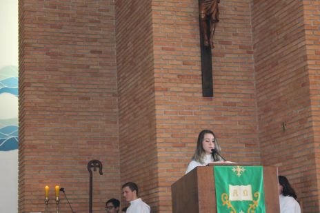 Viele Menschen waren am Sonntag, 27. 8. 2017 um 9 Uhr zum Festgottesdienst in die Kirche Nossa Senhora Aparecida gekommen. Zu Beginn der Messe trugen die Externen Mitglieder der CS ein Plakat mit dem Bild Hildegard Burjans herein, das im Altarraum aufgehängt wurde. Dazu wurde ein Lied mit dem schönen Text „Ich gehöre Gott, er sorgt für mich, was soll mir fehlen?" gesungen. Der Film, der zum Jubiläum gedreht wurde wurde in einer 10 Minuten Fassung vorgeführt. Darin werden MitarbeiterInnen der CS, CS Schwestern, Externe Mitglieder und Menschen, denen die CS in den 50 Jahren helfen konnte, interviewt. Nach dieser Präsentation fand der Einzug der Priester mit den liturgischen Diensten statt.