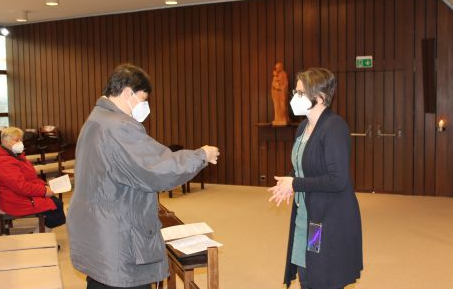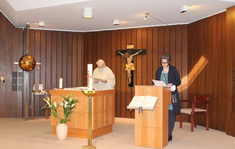 Sr. Susanne Krendelsberger begrüßte P. Michael Zacherl, der mit der kleinen versammelten Schar den letzten Gottesdienst in der Kapelle in Kalksburg feierte.
