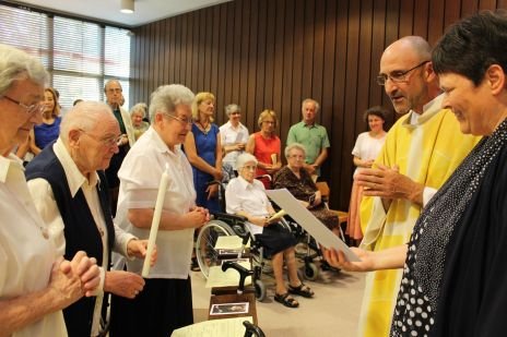 Sr. Egberta, Sr. Celine, Sr. Konrada, Sr. Emanuela und Sr. Amata feierten das 65jährige Jubiläum, Sr. Maria Angela und Sr. Hedwig feirten 60 Jahre Lebensweihe in der Caritas Socialis.