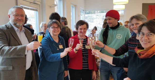 Mit Sekt stießen Direktor P. Friedrich Prassl SJ, Caritasdirektor der Erzdiözese Wien und Absolvent des 100. Kurses Klaus Schwertner, Kursleiterin Sr. Karin Weiler CS, Bereich Hospiz, Palliative Care und Demenz im Kardinal König Haus, die Kursbegleiterinnen Monika Aschauer, Krankenhaus Göttlicher Heiland, Gitti Ronniger, Tageshospiz der Caritas der Erzdiözese Wien, Maria Pöplitsch und die Teilnehmer*innen auf den 100. abgeschlossenen Lehrgang an.