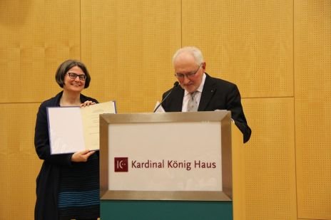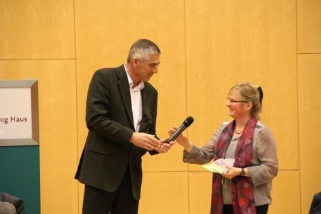 Im zweiten Teil des Abends übergab Prof. Erich Leitenberger den Kardinal König Förderpreis der Kardinal König Stiftung für die Einführungskurse für ehrenamtliche HospizbegleiterInnen an Sr. Karin Weiler CS, die diese Kurse im Kardinal König Haus leitet.