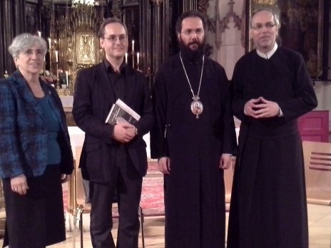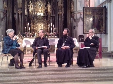 Auf dem Podium saßen neben P. Voith die Vorsitzende der Ordenskonferenz der Frauenorden der Diözesen Wien und Eisenstadt, Sr. Maria Judith Tappeiner, und der griechisch-orthodoxe Metropolit Arsenios (Kardamakis).