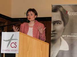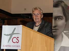 Sr. Patricia Erber SDS Obfrau des Vereins SOLWODI - Solidarität mit Frauen in Not, der von sechs Ordensgemeinschaften gegründet wurde, berichtete über die Begleitung von betroffenen Frauen in der von SOLWODI gegründeten Schutzwohnung. Es sei ein langer Weg, bis Frauen nach ihren traumatischen Erfahrungen, in der Lage seien, ihre Ausbeutungssituation selbst zu begreifen und bereit seien, gegen die Täter auszusagen. Sr. Susanne Krendelsberger CS Generalleiterin der CARITAS SOCIALIS und Obfrau-Stv. des Vereins SOLWODI, wies auf die lange Tradition der Caritas Socialis in der Unterstützung und Begleitung von Frauen hin, die schon auf Hildegard Burjan zurück gehe. Das Engagement der CS im Rahmen von SOLWODI sei ganz im Sinne Hildegard Burjans, die Menschen umfassend helfen wollte und zu Selbststand und Entwicklung ihrer Möglichkeiten verhelfen wollte.