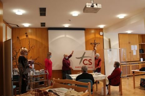 Am Sonntag, 8. 11. 2020 trafen die Schwestern in der Kapelle zu einem Ritual des Übergangs zusammen. Jede Schwester erzählte die schönste Erinnerungsgeschichte, die sie mit der Zeit in Kalksburg verband: der Fuchs, der sich in die Kapelle verirrt hatte, die Tomatenpflanze am Balkon oder die verwirrte Schwester, die das dunkle Kapellenkreuz reinigen wollte. Jede Schwester suchte 4-5 Mosaiksteine aus, die das CS Logo schmücken, das später in die Veitingergasse und in Kalksburg neu mitgenommen wird. Am Ende sprach Sr. Susanne die Sendung in die neuen Gemeinschaften aus: „Sr. Fides, ich sende dich in die Gemeinschaft im Wohnbereich Verena Buben. Lebe dort Caritas Socialis!" Die Schwestern antworteten mit: „Ich bin bereit!"