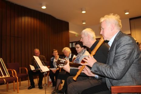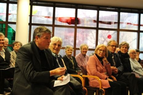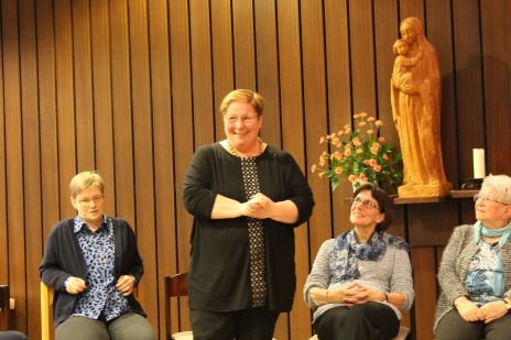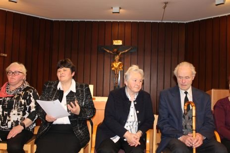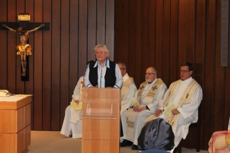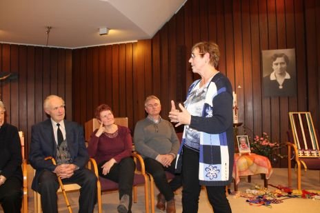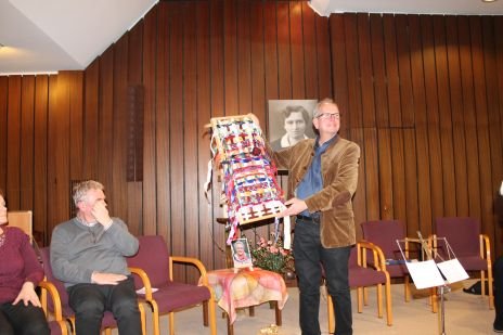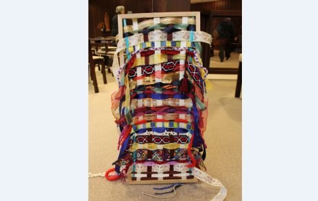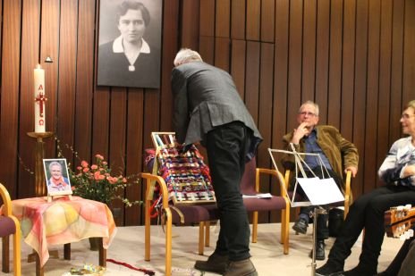 Nach dem Mittagessen fand eine Gedenkstunde in der Kapelle statt. Sr. Susanne Krendelsberger lud ein, von den Stationen im Leben Sr. Aurelia´s zu erzählen. Aus der Kindheit, von Vertreibung und Flucht erzählte ihr Bruder und Familienangehörige. Für jeden Beitrag wurde ein bunter Faden in ein Tuch gewoben. P. Josef Denkmayr erinnerte an den Bibelvers "Wie ein Weber hast du mein Leben zu Ende gewoben. Du schneidest mich ab, wie ein fertig gewobenes Tuch." Jes 38, 12 und überreichte am Ende der Gedenkstunde das fertig gewobene Tuch an die Schwestern.